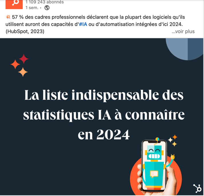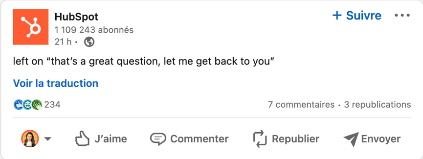 Pour ce qui est de l’audience anglaise, Hubspot arrive particulièrement bien à la toucher avec les contenus textuels, sous forme de posts LinkedIn très courts en format “tweet”. C’est une pratique qu’on observe très peu en France mais qui est très répandue et appréciée dans les pays anglophones.