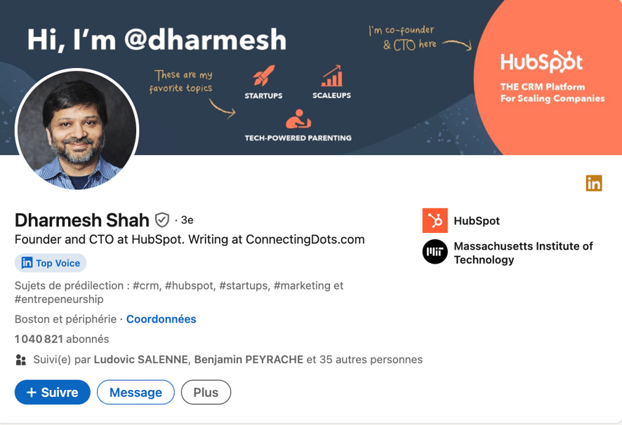 Plus d’un million d’abonnés, un titre LinkedIn Top Voice… Dharmesh communique de manière décontractée sur plein de sujets : entrepreneuriat, actualité, tech… !